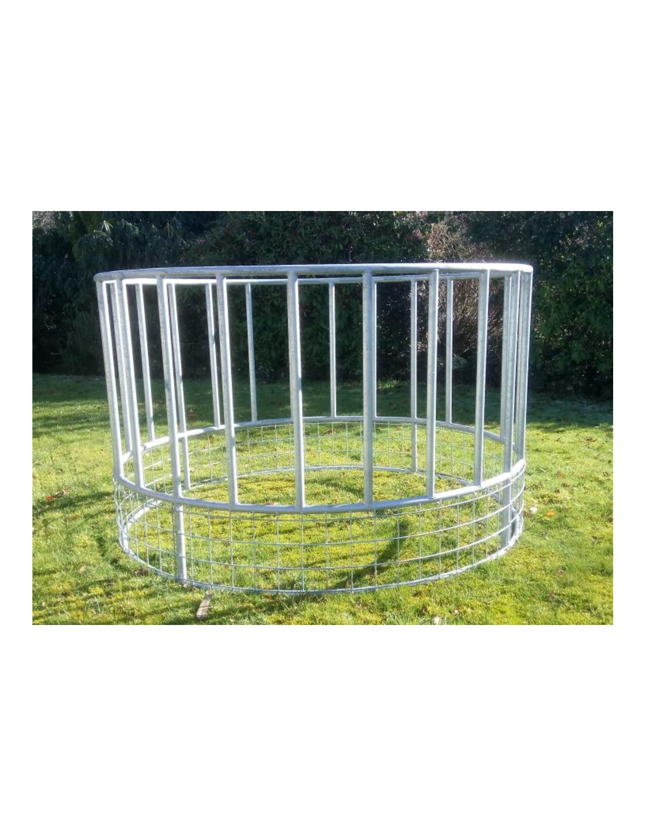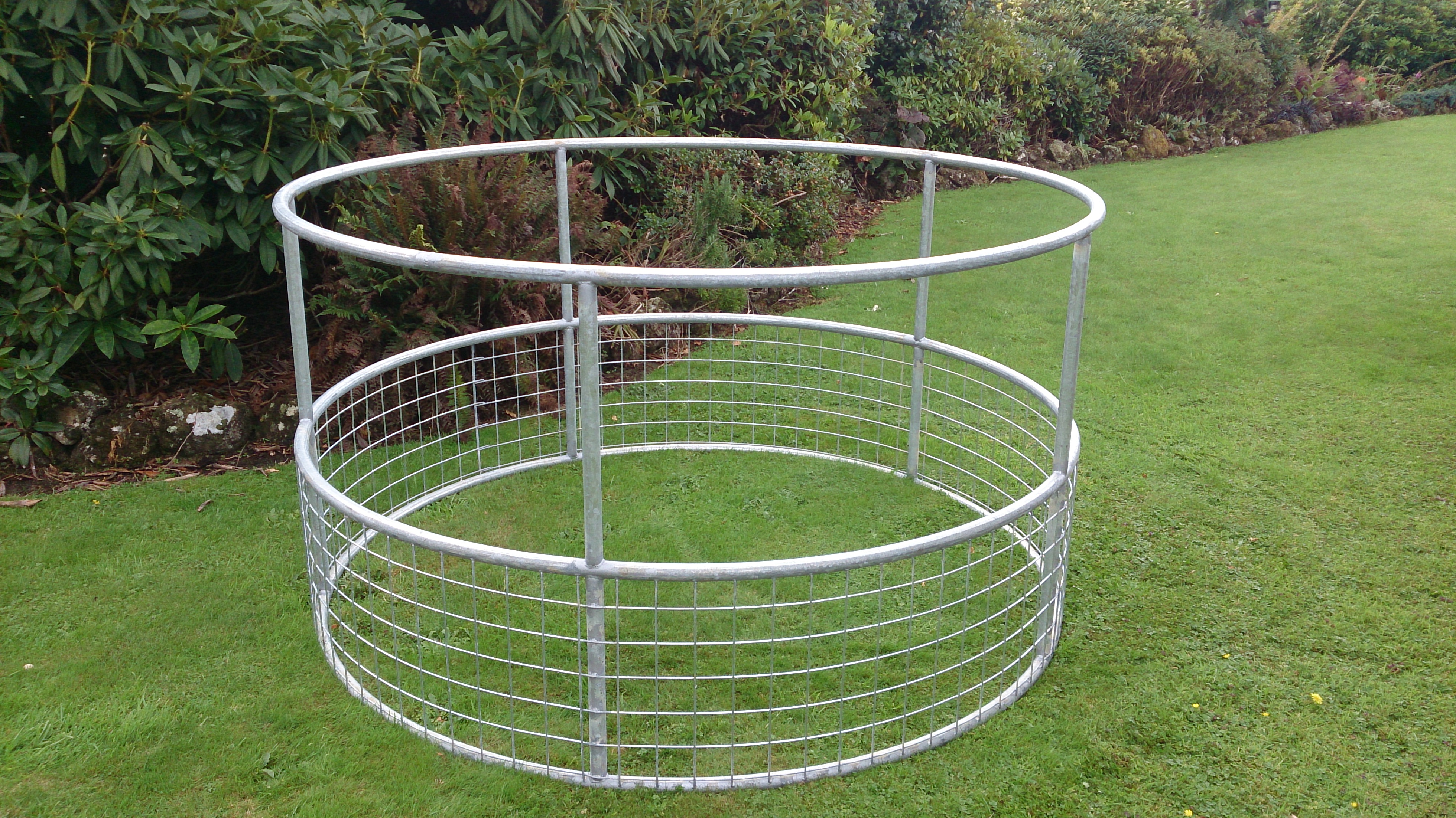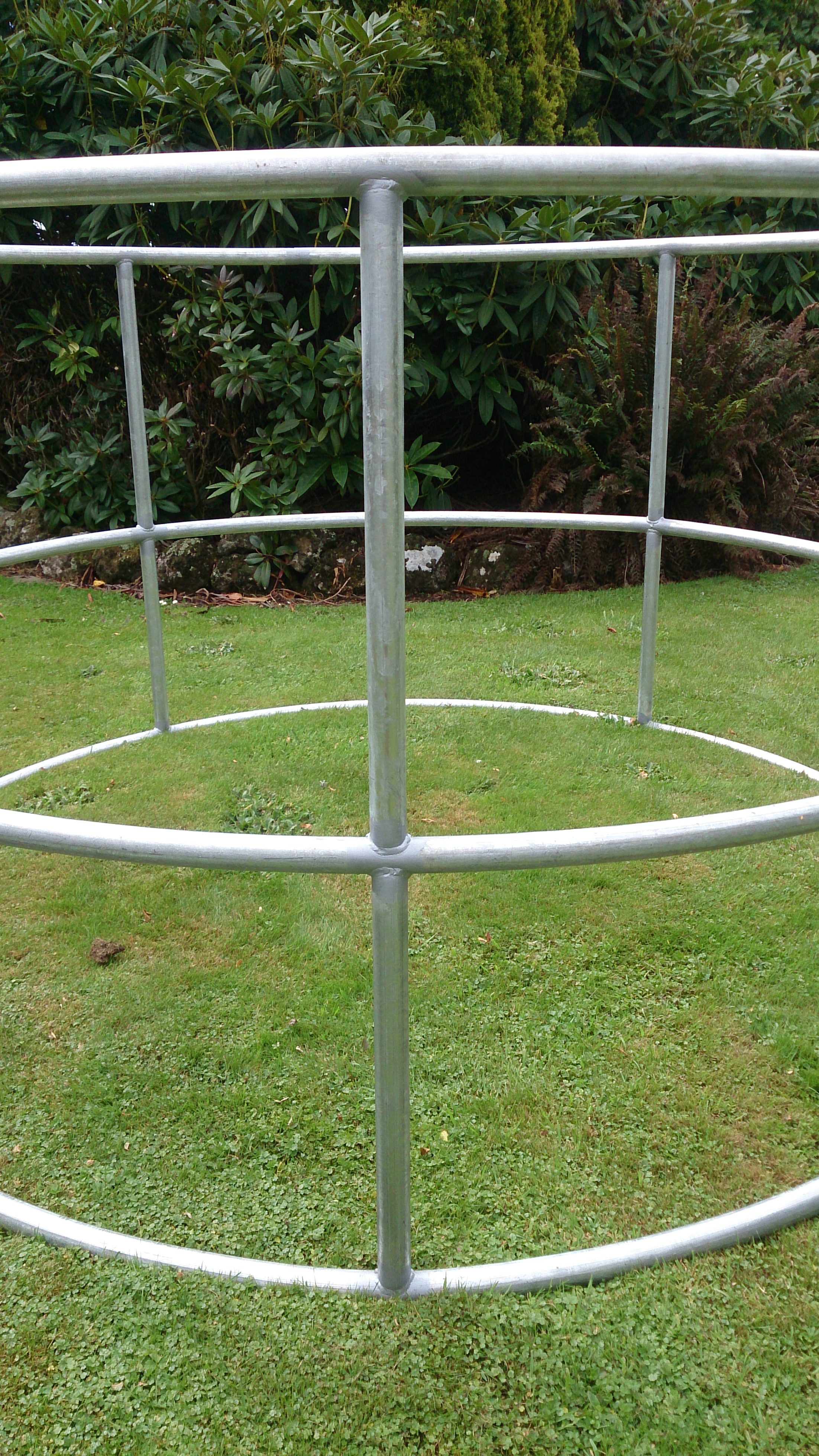 1.6 diameter, 1m high with 24 uprights. Fabricated out of 20nb medium wall, NZ mills galvanized pipe. The bottom mesh is 300mm high. This ring allows sheep to gain access to the bale without trampling on it.